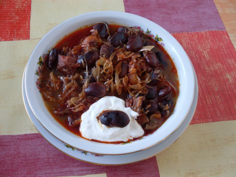 A hagymát összevágom, és a megpirított szalonnakockákon megfonnyasztom, hozzáteszem az összezúzott fokhagymát, meghintem pirospaprikával. Rádobom a leszűrt babot (előfőzöm a hús levével), majd a zöldségeket, paprikát, paradicsomot is hozzáadom és a hús levét felhasználva puhára főzöm. A sóval óvatosan bánni, mert a húslé nagyon sós lehet.