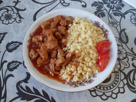Amikor minden megpuhult, belefőzöm a csipetkét, vagy nokedlit és hozzáadom a főtt, felaprózott húst, ezzel is forralom egyet. Kevés ecettel ízesítem. Tejföllel kínálok hozzá.