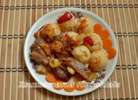 - A húsokat feldaraboljuk, fűszerezzük. Beletesszük a forró zsírba. Átforgatjuk. Öntünk hozzá egy kevés vizet, és puhára pároljuk. Zsírjára sütjük, és egy kicsit megpirítjuk. (Nem túlságosan, mert akkor kiszárad.)