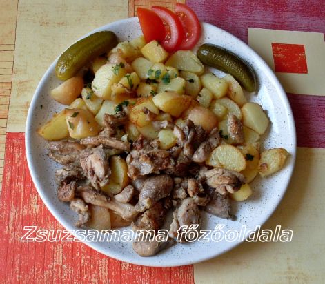 - A burgonyát héjában megfőzzük, kicsit lehűtjük, lehúzzuk a héját, daraboljuk, és forró zsírban megsütjük. A tányéron sózzuk, borsozzuk.