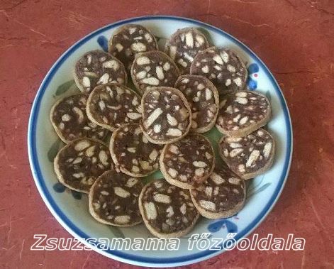 Tojást a cukorral és a kakaóval nagyon rövid ideig összefőzzük. Beledobjuk a nagy darabokra összetört kekszet, és a diót feldarabolva, majd a vajat.